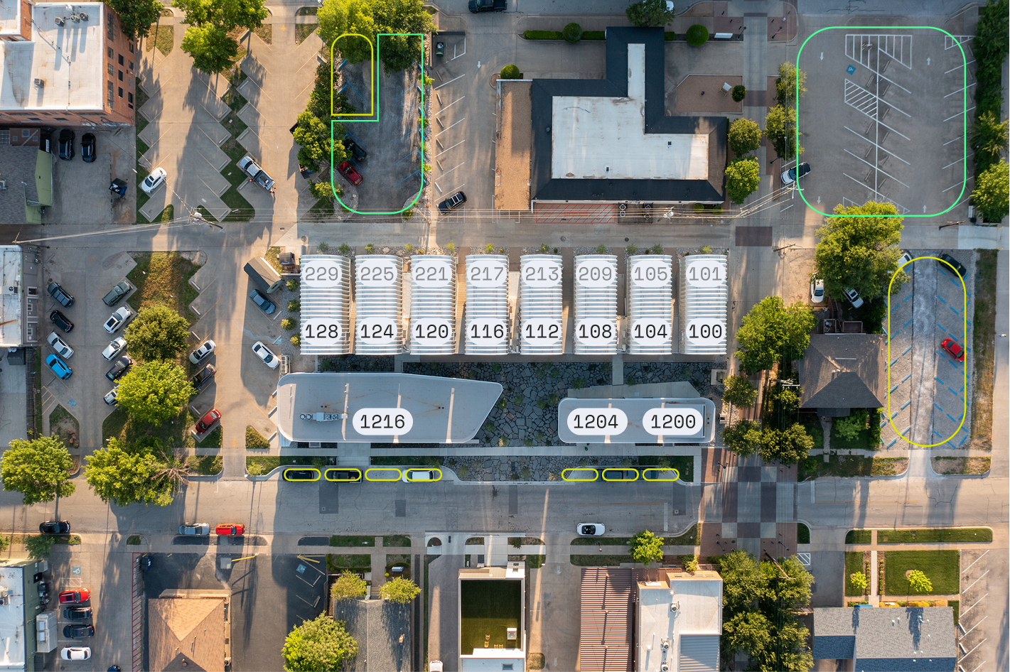 Commercial spaces feature floor to ceiling glass facades, front and back, doors that open to the park, access from both the ally and the park, most offices have private bathrooms, and also have access to the public bathrooms at PS1200. These spaces can be leased to one tenant, or seven, used for retail, or offices; they sit right on the public park, have full glass facades, and their activities can spill out into the public space.